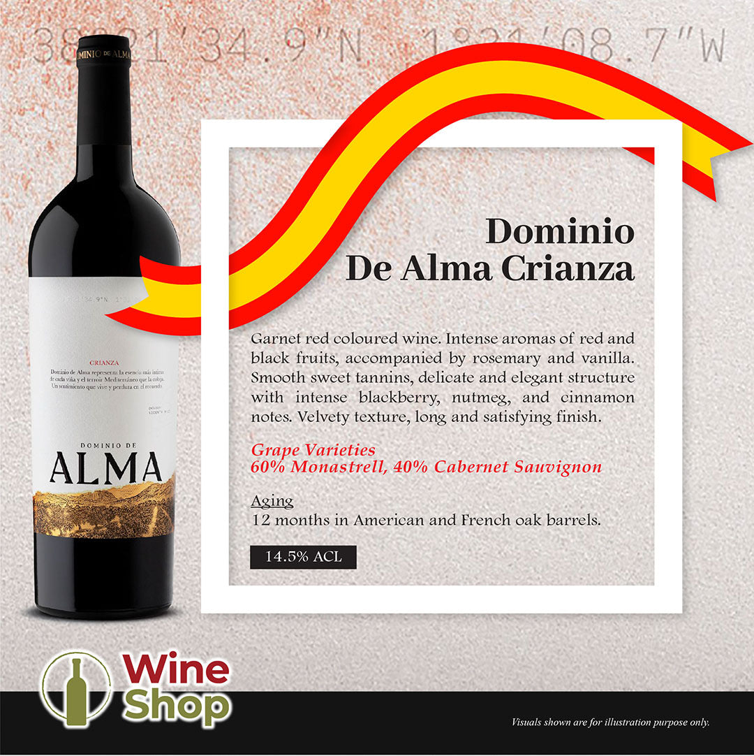 Dominio De Alma Crianza - Garnet red coloured wine. Intense aromas of red and black fruits, accompanied by rosemary and vanilla. Smooth sweet tannins, delicate and elegant structure with intense blackberry, nutmeg, and cinnamon notes. Velvety texture, long and satisfying finish.
