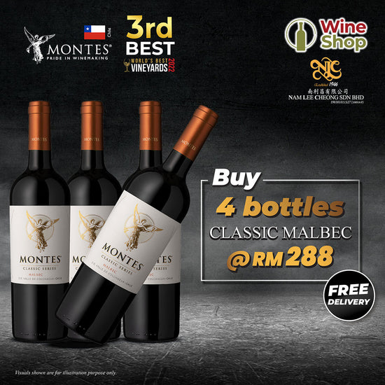 Montes Classic Malbec - The wine is deep ruby-red, tinged with purple at the rim. The nose delivers intense ripe fruit, such as cranberry, blackberry, and black plum, mingled with well-defined notes of nutmeg, toast and dulce de leche, derived from the French oak. The palate is balanced and broad, with smooth tannins and a medium body. The finish is long and in line with the nose.