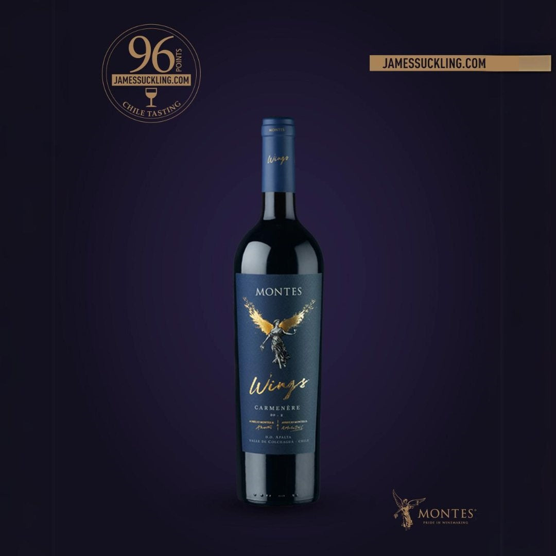 Montes Wings Carmenere 2020 - The wine shows a deep red colour, with the purple undertones very characteristic of Carmenère. The intense nose reveals aromas of black fruit, such as blackberry and blueberry, accompanied by pleasing spice notes of bell pepper and black pepper, joined by sweet notes from the French oak barrels, delivering a very complex wine. The rounded palate of the wine shows extreme smoothness and potency, with a very long, pleasant finish.